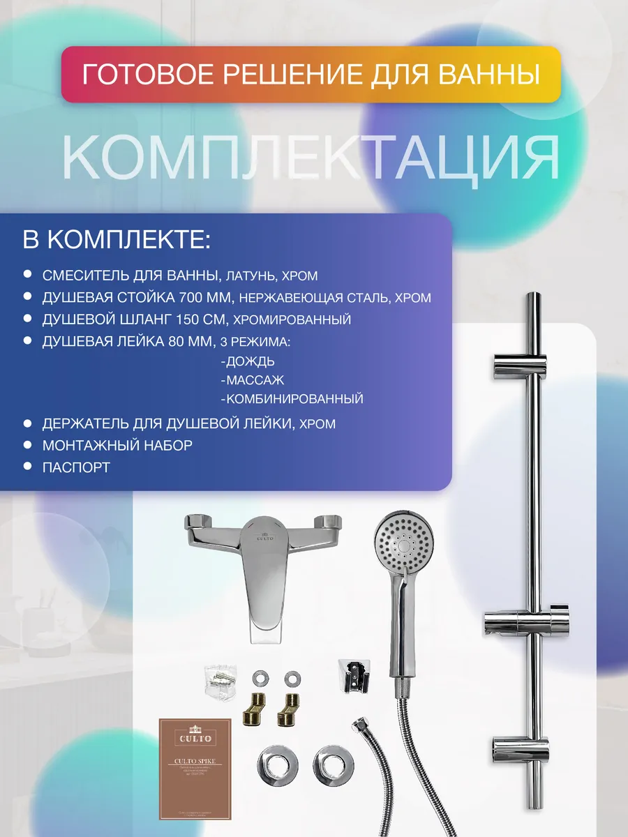 Усиленное гальваническое покрытие надежно защитит душевую стойку от коррозии, царапин и сколов. Уход за хромированной поверхностью максимально простой. Достаточно мыльного раствора и мягкой губки и внешний вид изделия будет радовать Вас долгие годы. Регулируемые сверху и снизу по высоте настенные крепления позволяют установить штангу в диапазоне до 660 мм на любом расстоянии по Вашему желанию, что особенно важно, если вы меняете старую штангу на новую. Вам не придется сверлить новые отверстия. Нашу душевую стойку можно установить в отверстия старой штанги. Мы рекомендуем оставлять по 2 см от края штанги для соблюдения визуальных пропорций. Дополнительным преимуществом станет скрытый монтаж регулируемых настенных держателей. При установке стойки Вы можете развернуть технические отверстия в невидимую зону. Смеситель для ванны обладает уникальным дизайном и станет незаменимым аксессуаром в ванную комнату. Продукция компании CULTO проходит контроль качества и изготавливается в соответствии с высокими международными стандартами.