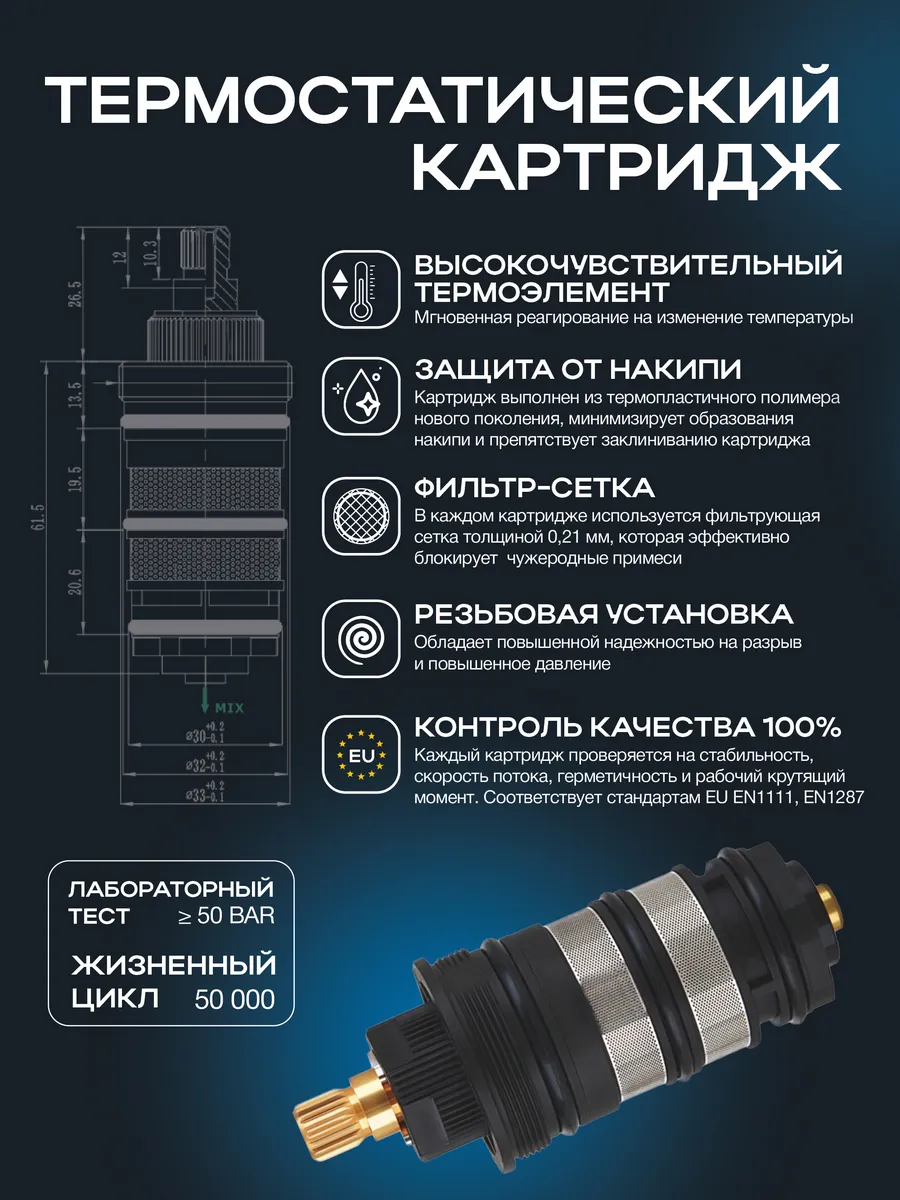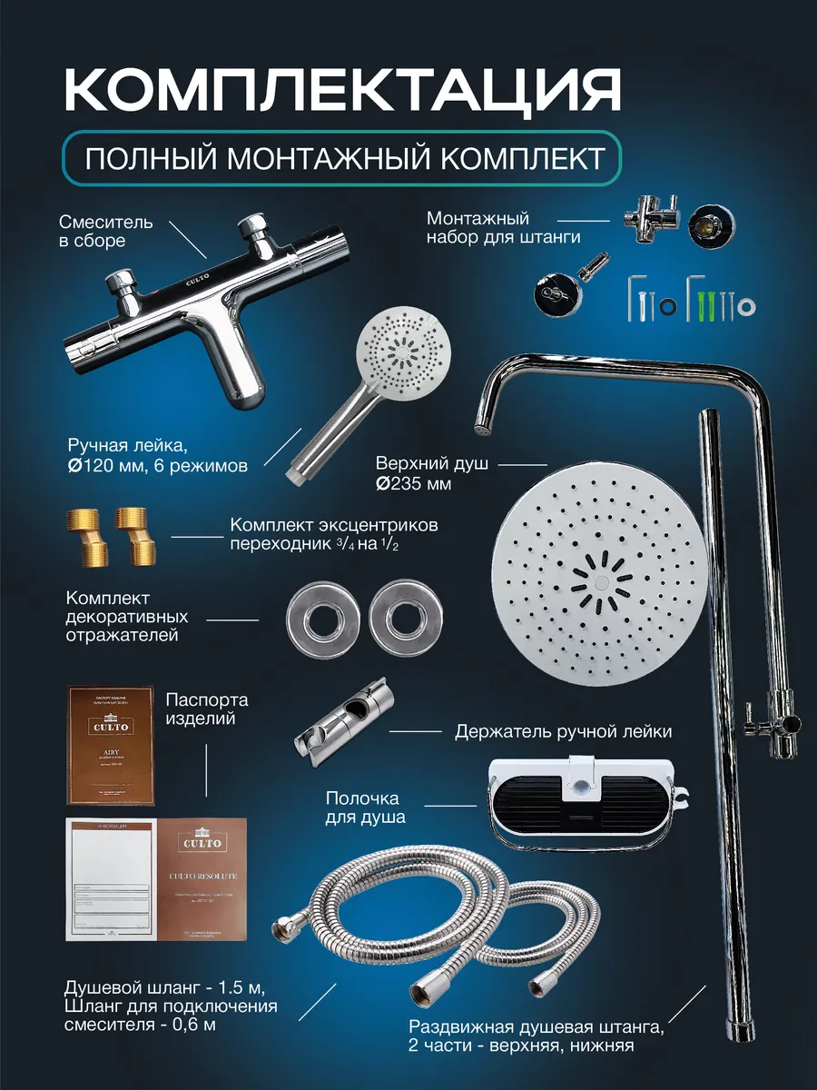 Качество и надежность смесителя с термостатом оценят по достоинству семьи с детьми и пожилыми родителями. Высокочувствительный термоэлемент мгновенно реагирует на изменение давления в водопроводной сети и температуры воды, гарантирует автоматическое поддержание температуры, надежно защищает от ожога даже при внезапном отключении холодной воды. Минималистичный дизайн смесителя идеальное решение, как для ванной, так и душевой комнаты. Особенность лейки дополнительный шестой режим “super jet” формированная струя воды под давлением, позволяет использовать лейку и для уборки ванной комнаты. Дополнительное преимущество наличие большой съемной полочки для шампуня. Полочка с перфорированным дном, легко разбирается, за ней легко ухаживать, вода не остается внутри. В комплекте 2 шланга. Душевой шланг - 150 мм, выполненный из хромированной нержавеющей стали и шланг для подключения к смесителю длинной 60 мм. Латунные гайки и штуцеры шлангов надежно защищают от образования коррозии.