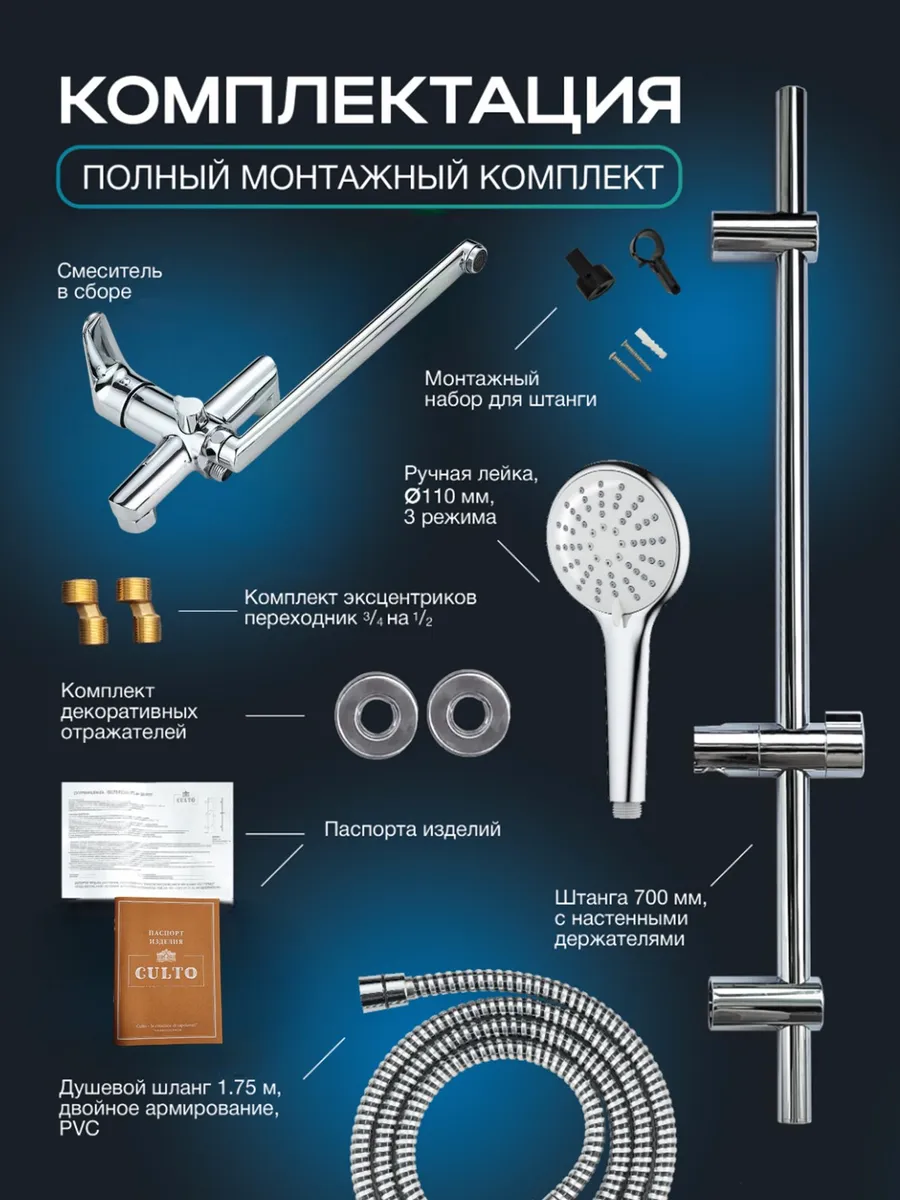 Оптимальное решение для тех, кто ценит функционал и комфорт серия Resolute. Набор состоит из смесителя с длинным изливом и функционального душевого гарнитура. Душевая штанга 700 мм выполнена из нержавеющей стали. Особенностью стойки являются регулируемые сверху и снизу по высоте настенные крепления, которые позволяют установить штангу в диапазоне до 660 мм на любом расстоянии, что особенно важно, если вы меняете гарнитур на новый. Мы рекомендуем оставлять по 2 см от края штанги для соблюдения визуальных пропорций. Дополнительным преимуществом станет скрытый монтаж регулируемых настенных держателей. При установке стойки Вы можете развернуть технические отверстия в невидимую зону. Душевая лейка диаметром 110 мм выполнена из ABS-пластика. Белая лицевая поверхность идеально сочетается с сантехникой. Мягкое переключение режимов от бодрящего массажа до расслабляющего режима «мягкий дождь» подарит комфорт. Душевой шланг увеличенной длины- 175 мм, выполненный из гибкого PVC. Материал обладает повышенной упругостью и стойкостью к перепаду температур. Двойное армирование шланга алюминиевой лентой и прочными нейлоновыми нитями дополнительно увеличивает срок службы. Армированные душевые шланги из ПВХ одни из самых прочных, не царапают поверхность, гигиеничные, препятствуют образованию плесени и грибка, и очень просты в уходе. Латунные гайки и штуцеры шланга надежно защищают от образования коррозии.