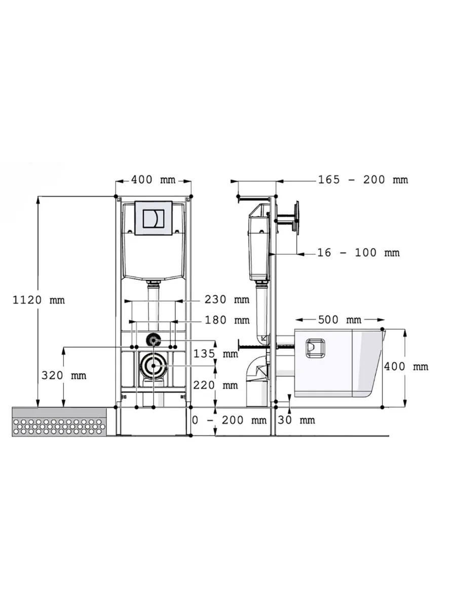 Металлическая самонесущая рама инсталляции весом 12,5 кг – покрыта порошковым напылением, толщина металлического профиля – 30×40 мм, оцинкованные стальные опоры рамы с регулировкой высоты, крепления чаши унитаза от 32 до 56 см, универсальные крепления, с возможностью присоединения к неровным и боковым поверхностям, которые входят в заводскую комплектацию изделия. Система инсталляции выдерживает нагрузку до 400 кг, монтажная высота 1,15-1,39 м для гипсокартонных стен и встраивания в пристенки, крепления для подвесного унитаза с возможностью монтажа чаш с фиксаций крепежа на 18 или 23 см, монтажная глубина от 100 мм до 175 мм Материал изделия - Металл/АБС пластик/полиэтилен.
