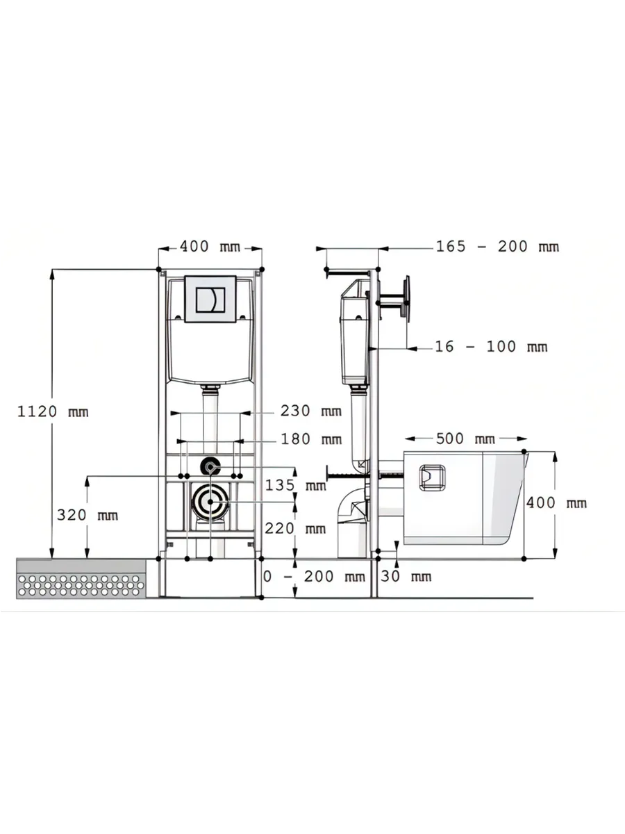 Металлическая самонесущая рама инсталляции весом 12,5 кг – покрыта порошковым напылением, толщина металлического профиля – 30×40 мм, оцинкованные стальные опоры рамы с регулировкой высоты, крепления чаши унитаза от 32 до 56 см, универсальные крепления, с возможностью присоединения к неровным и боковым поверхностям, которые входят в заводскую комплектацию изделия. Система инсталляции выдерживает нагрузку до 400 кг, монтажная высота 1,15-1,39 м для гипсокартонных стен и встраивания в пристенки, крепления для подвесного унитаза с возможностью монтажа чаш с фиксаций крепежа на 18 или 23 см, монтажная глубина от 100 мм до 175 мм Материал изделия - Металл/АБС пластик/полиэтилен.