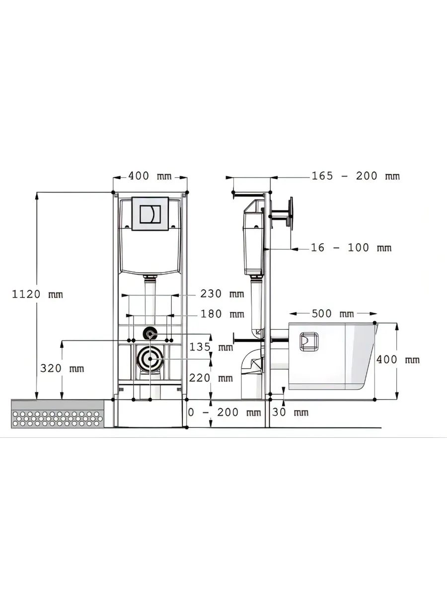 Металлическая самонесущая рама инсталляции весом 12,5 кг – покрыта порошковым напылением, толщина металлического профиля – 30×40 мм, оцинкованные стальные опоры рамы с регулировкой высоты, крепления чаши унитаза от 32 до 56 см, универсальные крепления, с возможностью присоединения к неровным и боковым поверхностям, которые входят в заводскую комплектацию изделия. Система инсталляции выдерживает нагрузку до 400 кг, монтажная высота 1,15-1,39 м для гипсокартонных стен и встраивания в пристенки, крепления для подвесного унитаза с возможностью монтажа чаш с фиксаций крепежа на 18 или 23 см, монтажная глубина от 100 мм до 175 мм Материал изделия - Металл/АБС пластик/полиэтилен.