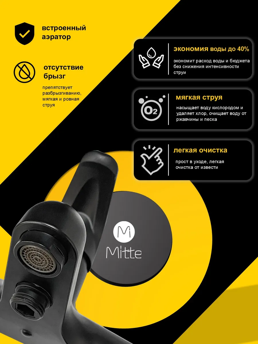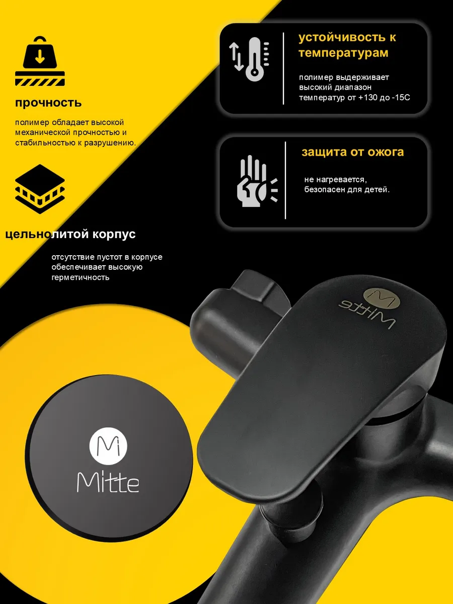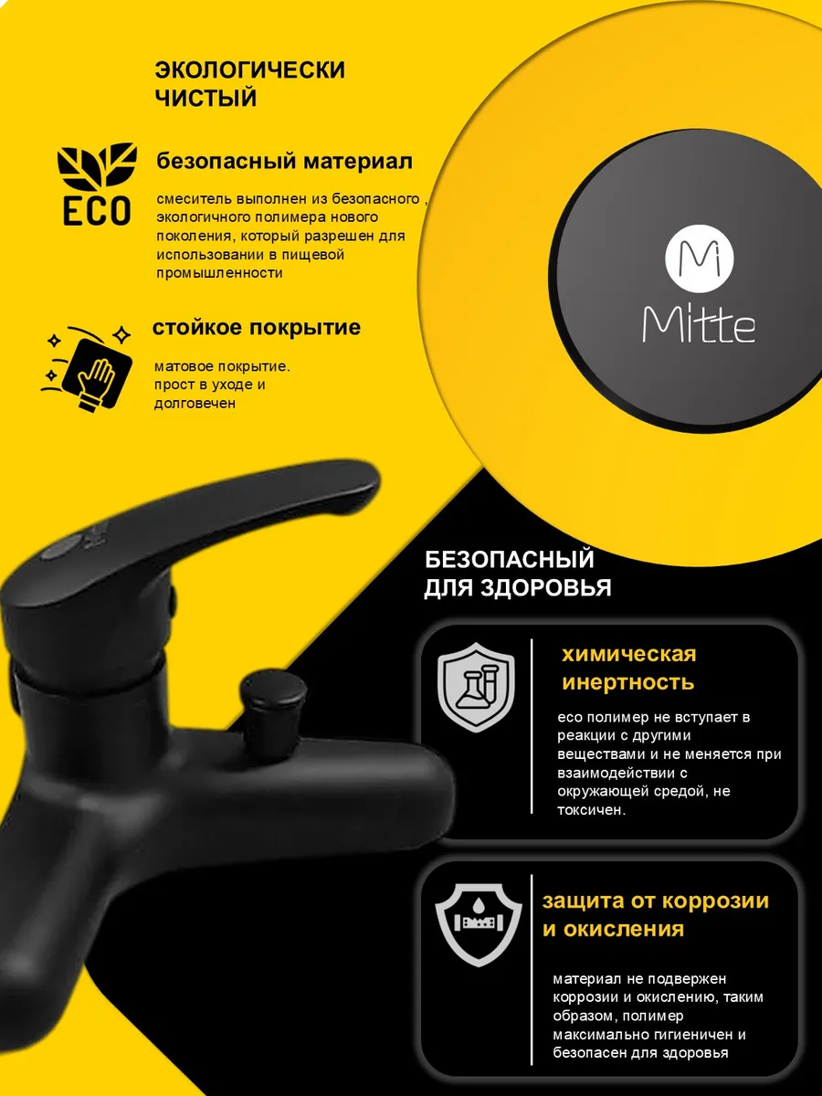 Смеситель для ванны Mitte серии YASY BLACK изготовлен из высокопрочного ABS-пластика, данный полимерный материал сертифицирован ГОСТом. Данный тип смесителей применяется в помещениях с нерегулярным водоснабжением. Использование пластиковых кранов на даче позволяет избежать деформации смесителя при температурах до минус 15 градусов, при выключенном водоснабжении. Высокотехнологичные полимерные смесители нового поколения не подвержены коррозии, а также обладают химической инертностью: не выделяют никаких посторонних веществ в проходящую через них воду. Экополимер сертифицирован для применения в пищевой промышленности. Смесители изготовленные из полимеров обладают очень низкой теплопроводимостью, что позволяет избежать ожогов при резких перепадах температуры воды, подаваемой в смеситель. Смеситель для кухни имееты высокий излив и оснащен долговечными керамическими кран-буксами. Высокопрочное хромированное покрытие показывает большую устойчивость к внешним повреждениям, именно на пластиковых поверхностях. Продукция компании Mitte проходит контроль качества и изготавливается в соответствии с высокими международными стандартами. Гарантия производителя 2 года.