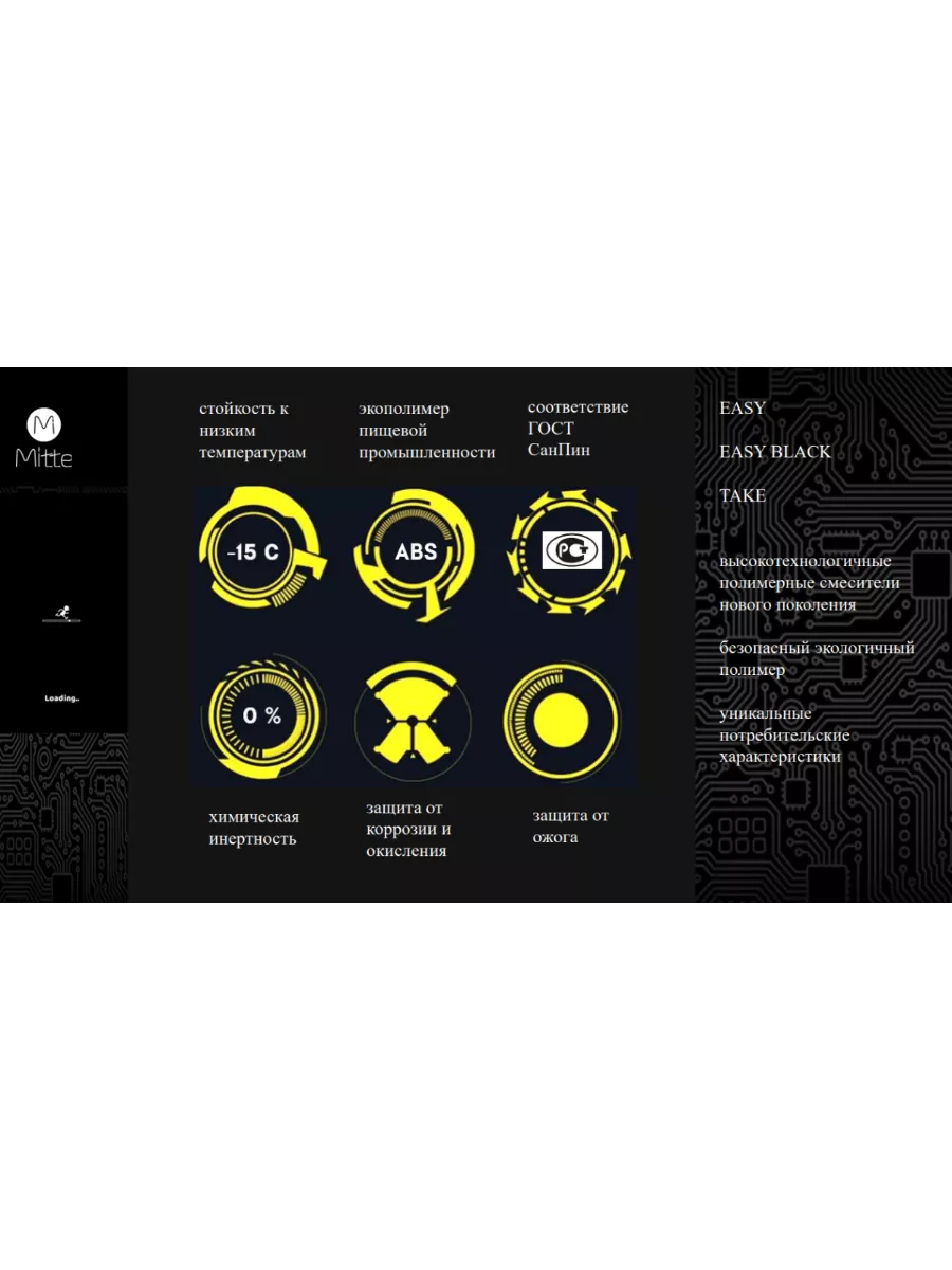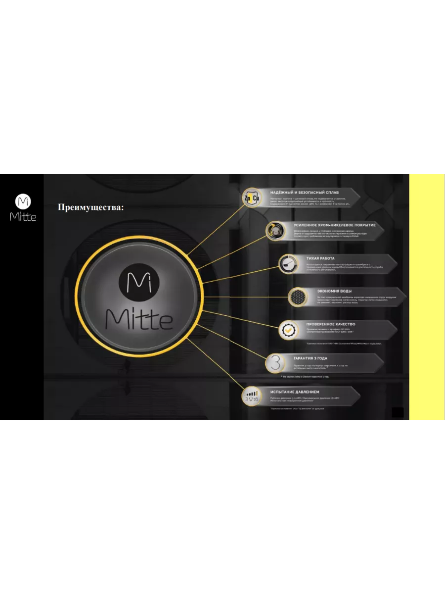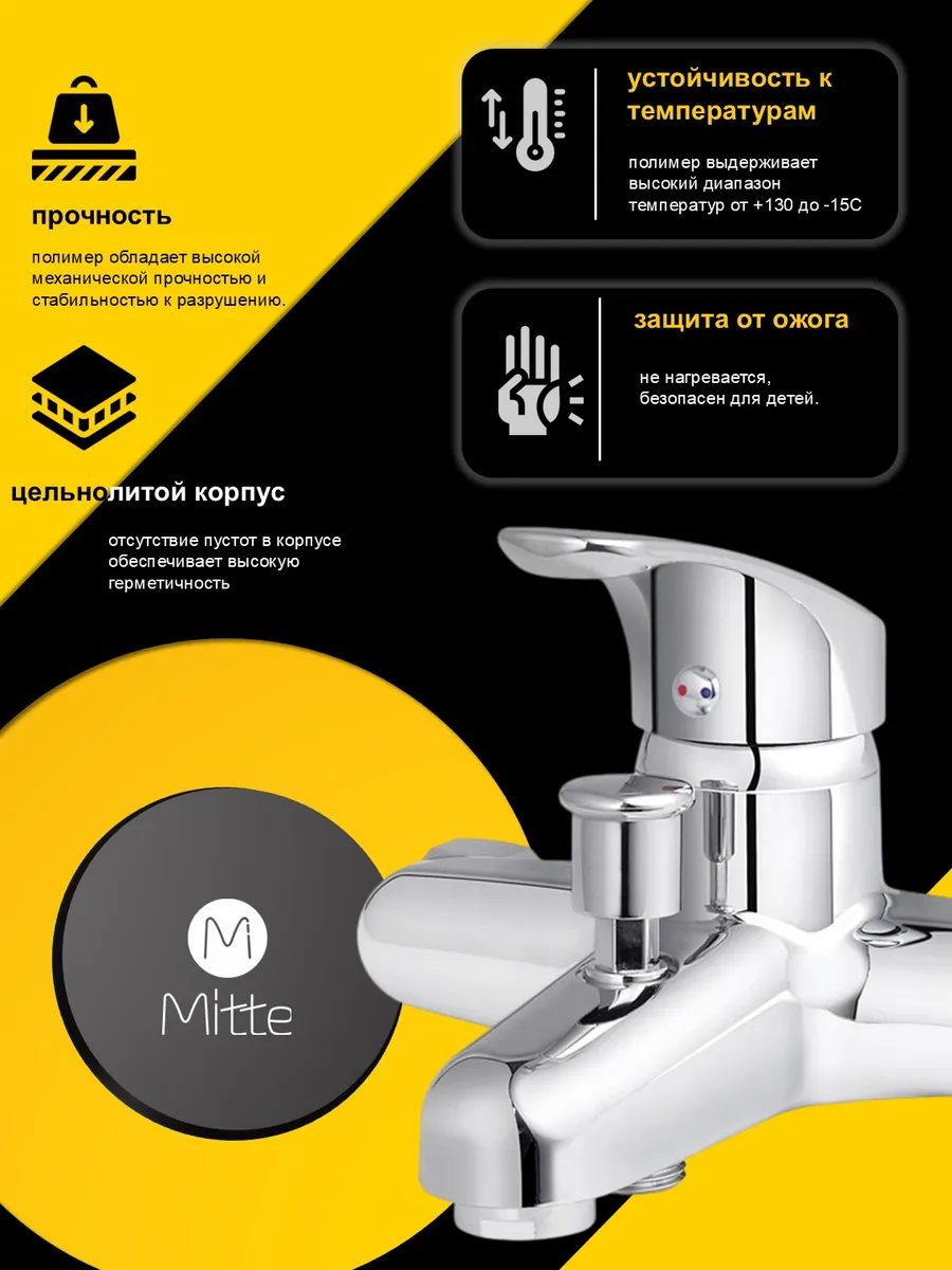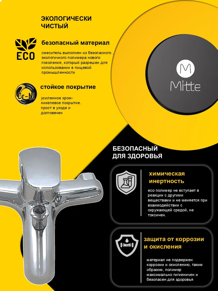 Смеситель Mitte серии YASY изготовлен из высокопрочного ABS-пластика, данный полимерный материал сертифицирован ГОСТом. Недорогой смеситель применяется в помещениях с нерегулярным водоснабжением. Использование пластиковых кранов на даче позволяет избежать деформации смесителя при температурах до минус 15 градусов, при выключенном водоснабжении. Высокотехнологичные полимерные смесители нового поколения не подвержены коррозии, стойки к царапинам, а также обладают химической инертностью: не выделяют никаких посторонних веществ в проходящую через них воду. Экополимер сертифицирован для применения в пищевой промышленности. Смесители изготовленные из полимеров обладают очень низкой теплопроводимостью, что позволяет избежать ожогов при резких перепадах температуры воды, подаваемой в смеситель. Смеситель для кухни имееты высокий излив и оснащен долговечными керамическими кран-буксами. Высокопрочное хромированное покрытие показывает большую устойчивость к внешним повреждениям, именно на пластиковых поверхностях. Продукция компании Mitte проходит контроль качества и изготавливается в соответствии с высокими международными стандартами. Гарантия производителя 2 года.